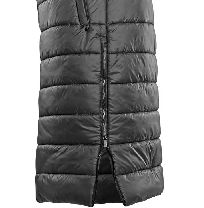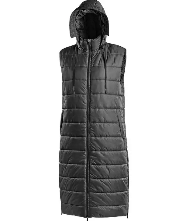 Dámská dlouhá zateplená vesta s odepínací kapucí. Vesta je vybavena oboustranným zipem, bočními rozparky na zip, boční kapsami na zip a vnitřní kapsou na zip. Na kapuci, podél hlavního zipu a rozparku se nachází decentní černé reflexní doplňky pro zvýšení viditelnosti.
