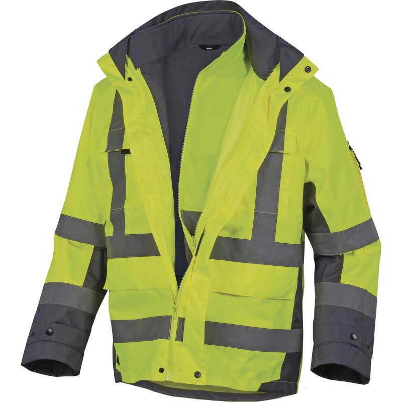 Bunda 4 v 1, odnímatelná vesta. Bunda do deště: Vodotěsné švy. Zapínání na zip krytý lištou s druky. 6 kapes. Vysoká viditelnost: Třída 3 - stříbrná barva. Druh: paralelní, ramenní. Odnímatelná podšívka: Zapínání na zip. Konce rukávů se speciální úpravou. 2 kapsy. Vysoká viditelnost: Třída 2 - stříbrná barva. Druh: ramenní.