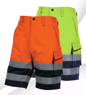 Pracovní reflexní bermudy Panostyle. 54% bavlna, 46% polyester. 260 g/m2. Třída 2. Elastické vložky v pase. Reflexní pásky šité: Třída 1 - stříbrná barva. 5 kapes.
