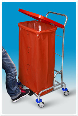 Chromovaný vozík na pytel 120l s víkem, které ovládá nožní pedál.
