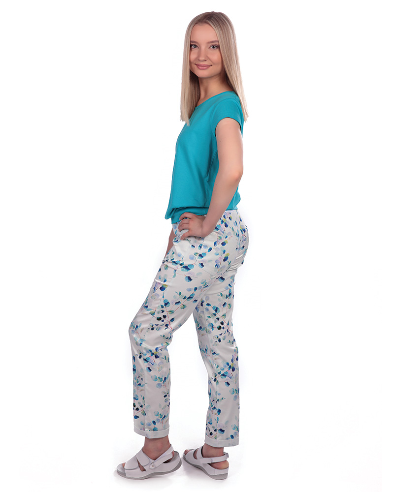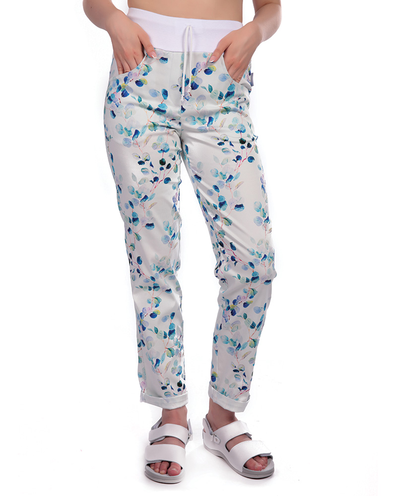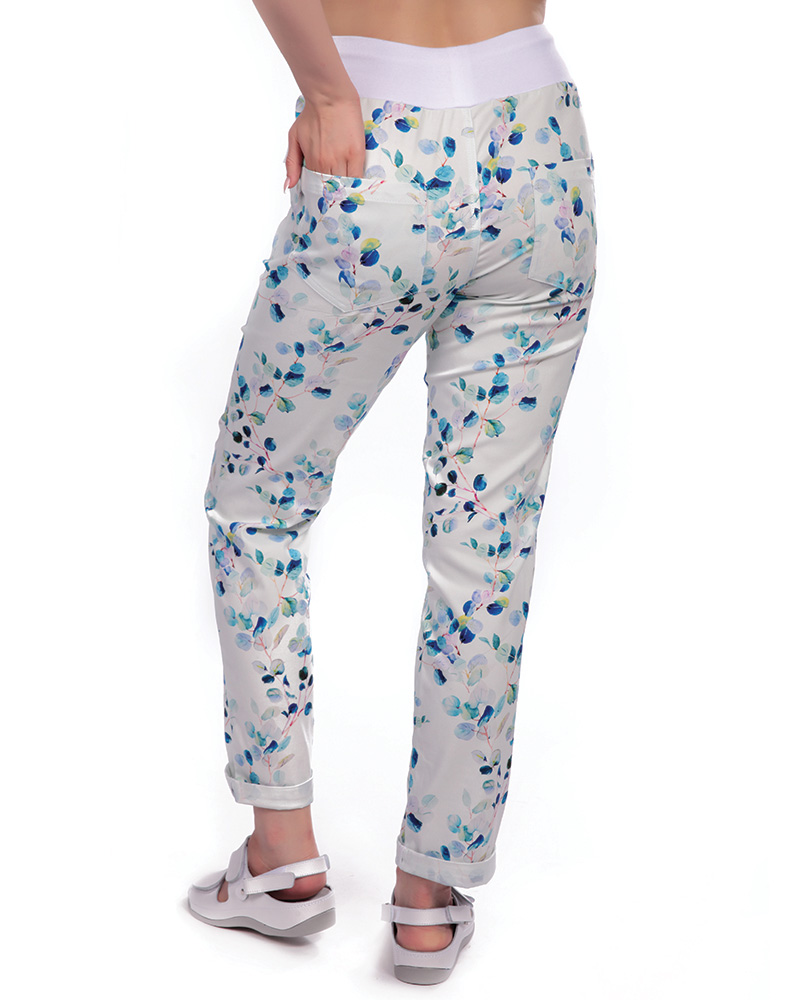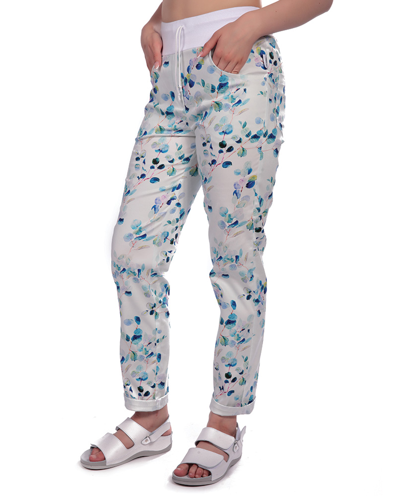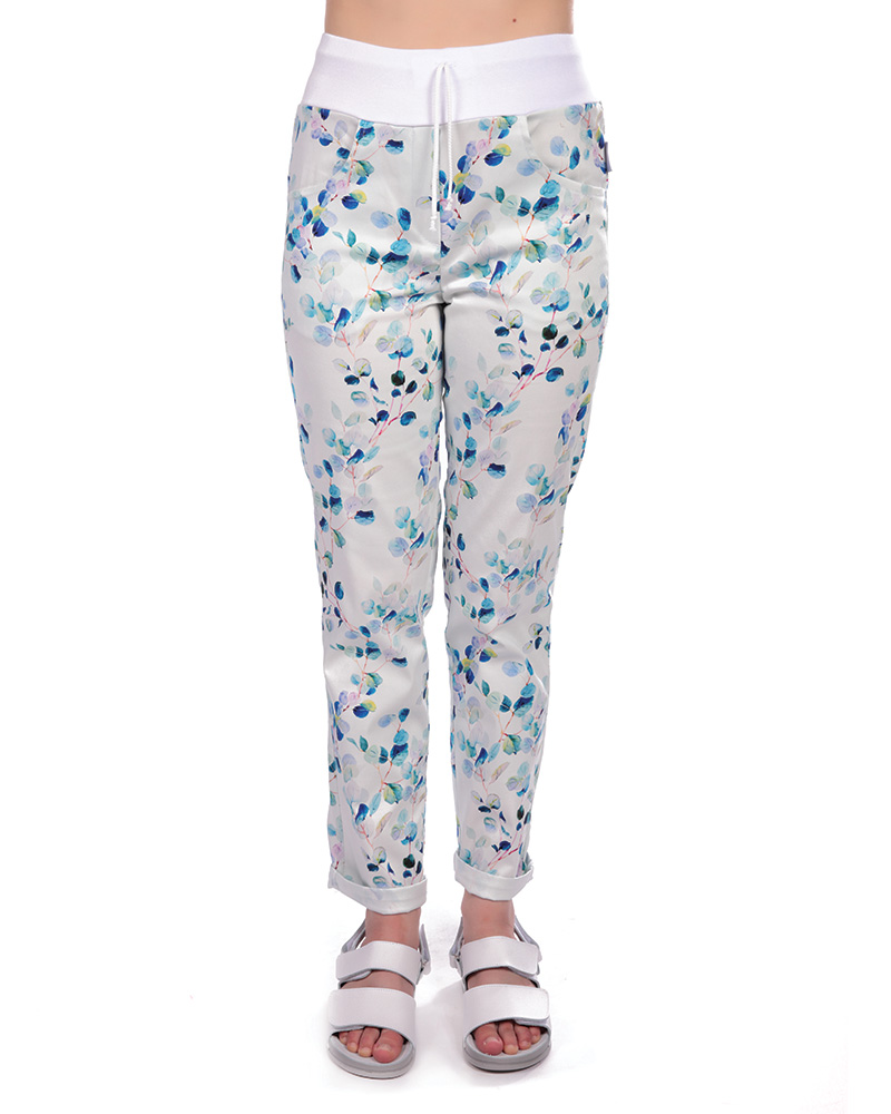 Kalhoty dám. BEATA, 2451,úplet s tkanicí,nohavice do manžety, BA/Elas 190,VS168, malé listy/bílý úpl |