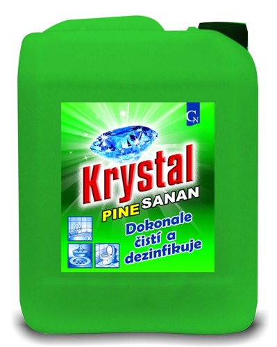 Krystal PINE SANAN je vysoce účinný čistící alkalický a extra hustý čistící a dezinfekční gel. Odstraňuje tuky, bílkoviny, usazenou špínu a skvrny. Dobře působí i na těžko dostupných místech. Snadno přilne k povrchu i na svislých plochách, takže zvyšuje mycí i dezinfekční účinek. Ničí bakterie, likviduje nepříjemný zápach, dezinfikuje, čistí a bělí. Je vhodný pro použití v domácnostech, zdravotnictví, potravinářství a v zemědělství. Je vhodný zejména na záchodové mísy a pisoáry, umyvadla, vany, dřezy, podlahy, kachličky, pracovní plochy a odpady. Synergický účinek směsi tenzidů a přísady s bělícími vlastnostmi předurčuje tento výrobek k širokému použití v různých oblastech. Pěnivost prostředku zvyšuje smáčecí schopnosti.