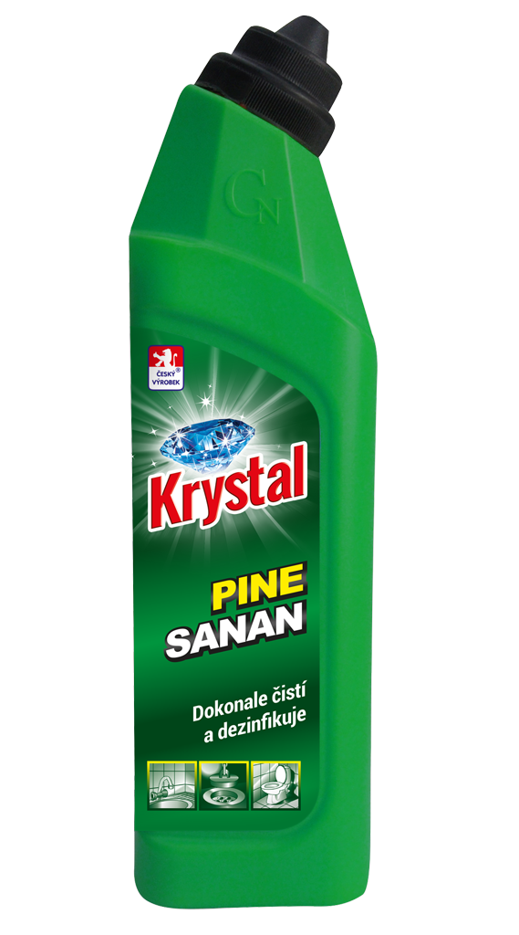 Krystal PINE SANAN je vysoce účinný čistící alkalický a extra hustý čistící a dezinfekční gel. Odstraňuje tuky, bílkoviny, usazenou špínu a skvrny. Dobře působí i na těžko dostupných místech. Snadno přilne k povrchu i na svislých plochách, takže zvyšuje mycí i dezinfekční účinek. Ničí bakterie, likviduje nepříjemný zápach, dezinfikuje, čistí a bělí. Je vhodný pro použití v domácnostech, zdravotnictví, potravinářství a v zemědělství. Je vhodný zejména na záchodové mísy a pisoáry, umyvadla, vany, dřezy, podlahy, kachličky, pracovní plochy a odpady. Synergický účinek směsi tenzidů a přísady s bělícími vlastnostmi předurčuje tento výrobek k širokému použití v různých oblastech. Pěnivost prostředku zvyšuje smáčecí schopnosti.