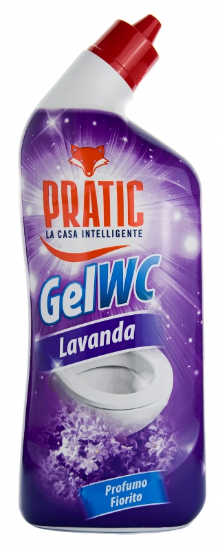 Extra silný, hygienizující a gelový čistící prostředek na WC Pratic LAVANDA s vůní levandule, který odstraní i ty nejodolnější vápenaté usazeniny i pod okrajem záchodové mísy.