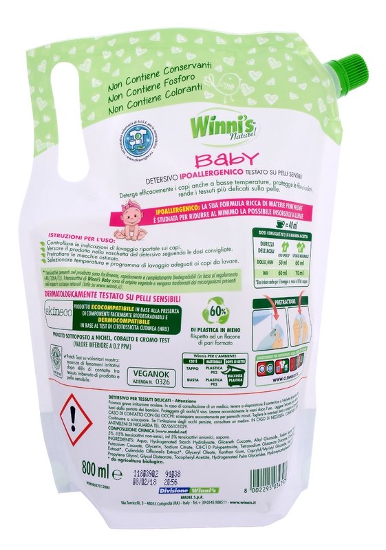 Prací gel pro dětské prádlo s přídavkem přírodní aviváže Winnis 2v1. Hypoalergenní receptura minimalizuje výskyt alergií, dermatologicky testované pro nejjemnější citlivou pokožku kojenců a novorozeňat. Účinně čistí oděvy při nízkých teplotách, chrání vlákna a barvy, zjemňuje tkaniny, obsahuje enzymy pro lepší praní skvrn a extrakty z heřmánku a měsíčku lékařského. Obsah niklu, kobaltu, chromu (< 0,2 ppm). Neobsahuje fosfor, barviva ani konzervanty. Balení eco-refill šetří až 60 % plastu v porovnání s běžným obalem.