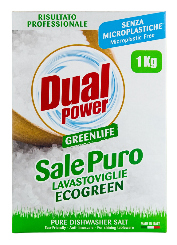 DUAL POWER GREENLIFE sůl do myčky nádobí. Neobsahuje mikroplasty. Změkčuje vodu.
