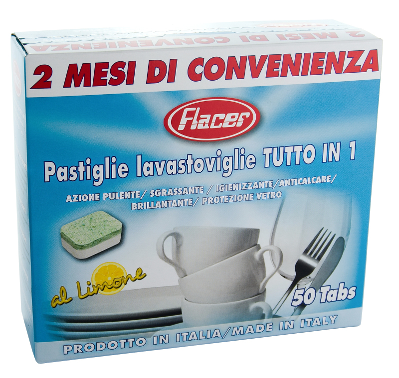 FLACER tablety do myčky nádobí. Vše v jednom: čištění, odmašťování, ochrana proti vodnímu kameni, lesk, ochrana skla. Aktivní s vodou jakékoliv tvrdosti. Pro dlouhé mycí cykly při teplotě 50 - 65 °C. V myčce nádobí nemyjte křišťál, dřevo, hliník, měď, stříbro a zdobené dekorativní nádobí.