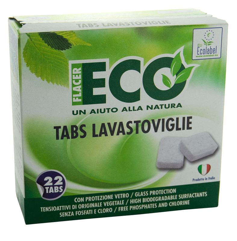ECOFLACER TABS LAVASTOVIGLIE ekologické tablety do myčky nádobí. Účinné při nízkých teplotách. S ochranou skla, s rostlinnými tenzidy, bez fosfátů a chloru. Aktivní s vodou jakékoliv tvrdosti.
