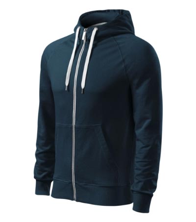 Celopropínací pánská mikina s kontrastními prvky. Kovový zip zdobený Malfini logem v kontrastní barvě. Kapuce s podšívkou, na stažení kontrastní šňůrkou. Raglánové rukávy s ozdobným prošitím. Začištění průkrčníku kontrastní páskou. Dolní lem a manžety rukávů ze žebrového úpletu 2:2 s přídavkem 5 % elastanu.