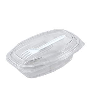 Plastové jednorázové oválné PET misky s víčkem a vidličkou 350 ml.