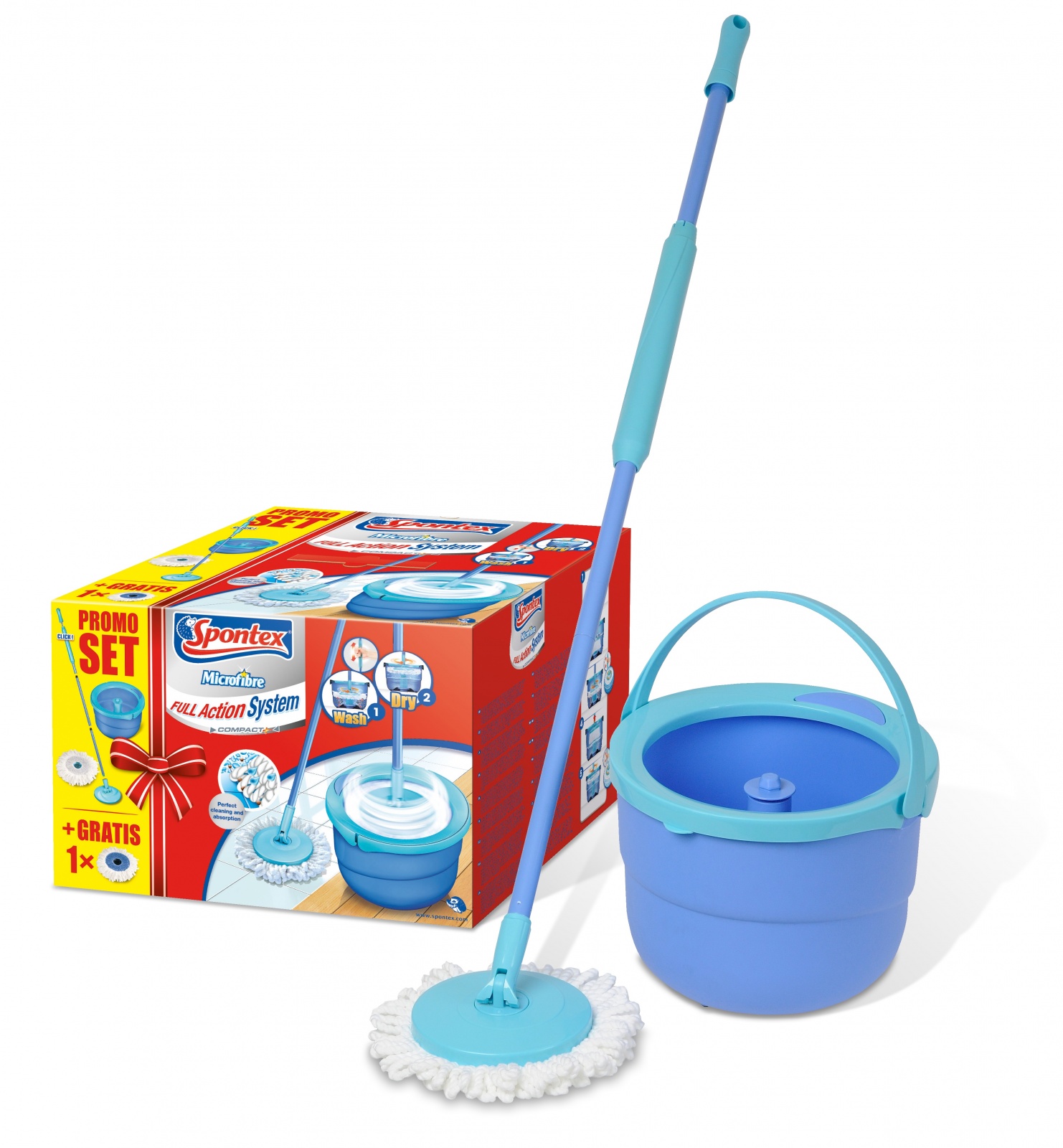 Rotační třásňový mop s novým odstředivým mechanismem, ždímání mopu je založeno na dvou úrovních kbelíku - spodní úroveň pro namočení mopu a vrchní úroveň pro vyždímání, díky kompaktnímu menšímu balení lépe skladovatelné a vhodné do menších prostor, vhodný pro všechny typy podlah, sada obsahuje vědro s výlevkou o objemu 6 l (doporučený objem k rysce MAX), běžnou univerzální náhradu o průměru 25 cm, druhou abrazivní náhradu o průměru 25 cm a mop se zabudovaným rotačním mechanismem v tyči o délce 120 cm, celková mopu délka 128 cm, šířka vědra 32 cm, výška vědra 24 cm.