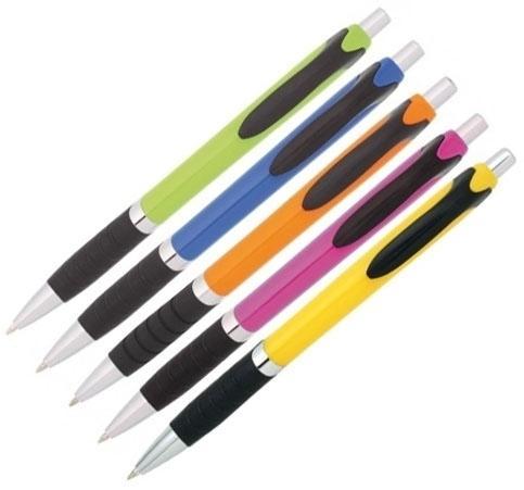 Plastové kuličkové pero s černým pogumovaným úchopem s vroubky, zakončený stříbrným proužkem