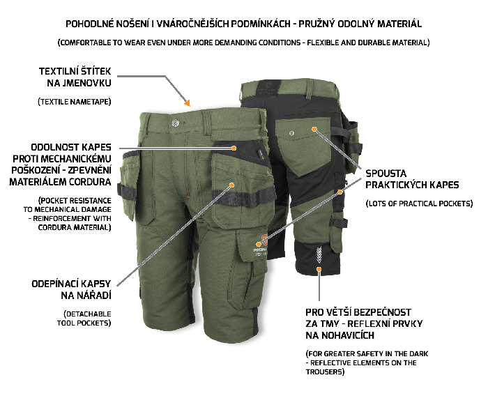 namáhané části v oblasti kapes jsou zpevněné materiálem Cordura, což znamená, že se vyznačují vysokou pevností a odolností vůči otěru a jiným mechanickým poškozením