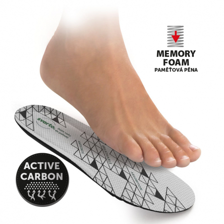 Jsou vyrobeny ze 100% recyklované antibakteriální a antistatické PU pěny s obsahem aktivního uhlíku, který výborně absorbuje vlhkost. Měkká a zároveň pružná struktura Integrované paměťové pěny, jejíž chování se mění v závislosti na teplotě, se přizpůsobí anatomii nohy a zajistí ideální rozložení tlaků plosky nohy.