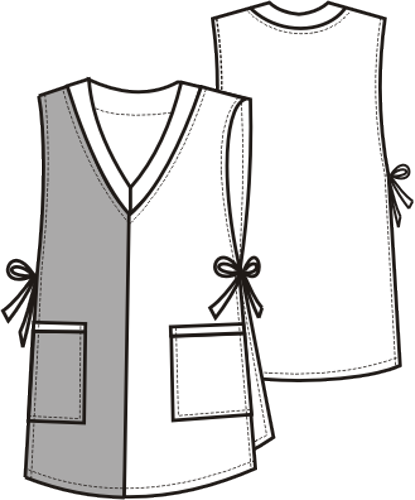 Zástěra přes hlavu s výstřihem do špičky - klokánka. Přední díly barevně kombinované s nakládanými kapsami. Zavazování na bocích. 100%Ba, plátno 145g/m2.