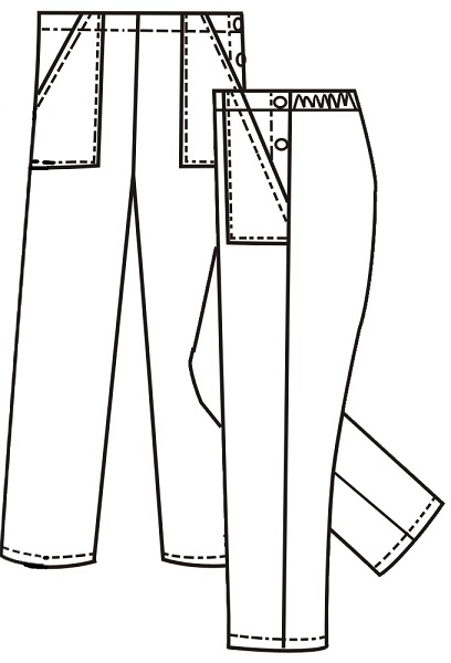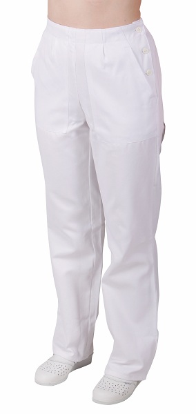 Kalhoty do pásku s pruženkou v zadním díle. Přední kapsy. Boční zapínání na knoflíky. Materiál: 100%Ba,kepr,245g/m2-bílá. Velikost: 42-64. Zboží na objednávku, dodací lhůta se pohybuje většinou do 3 týdnů