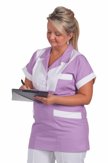 Halena s fazónkou do sedla, zapínání na knoflíky. Barevně kombinovaná. Krátké kimono rukávy s manžetou. Přední díly členěné. Boční kapsy váčkové s lištou. Náprsní kapsa do švu. Materiál: 100%Ba,kepr,165g/m2. Barva: bílá/fialová