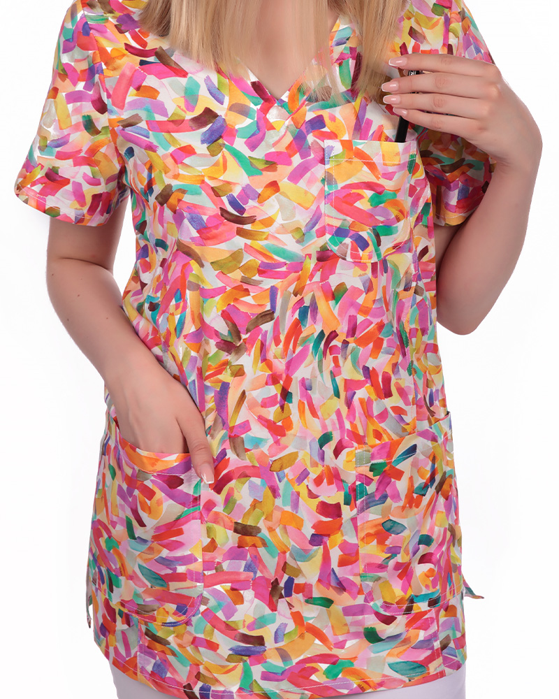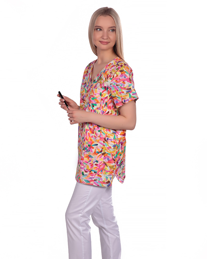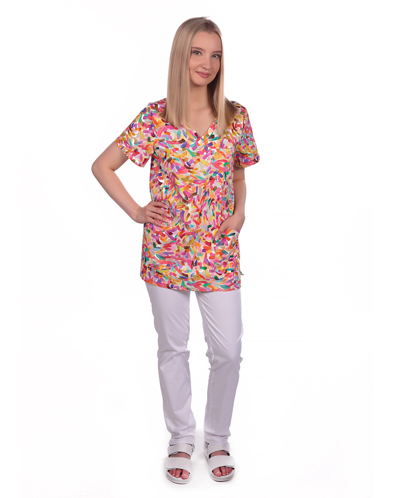Halena přes hlavu,přední díl je členěný princesovými švy, které jsou ozdobně prošité dvoujehlou. Na předním díle je našita náprsní kapsa a dvě boční kapsy dvoujehlou. Krátké rukávy jsou všité do průramků. V bočním švu haleny jsou rozparky.