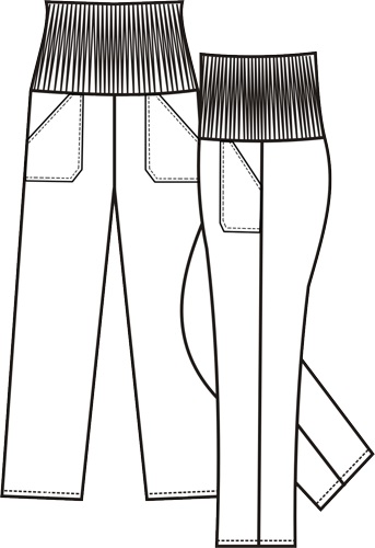 Dlouhé nohavice mají v předním díle odšité puky. Jsou všité v pase do elastického dvojitého úpletu pod pasem. Kalhoty jsou bez kapes.