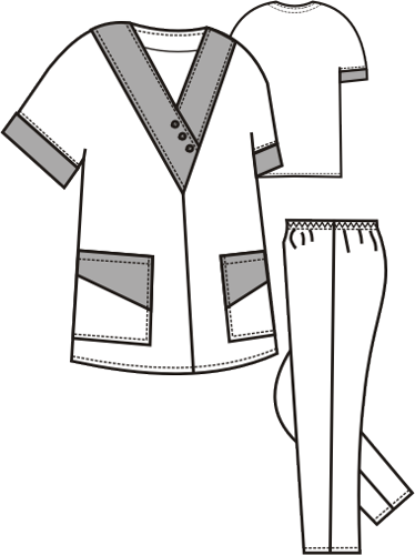 Halena přes hlavu se špičatým výstřihem. Barevně kombinovaná - bílá/zelená tyrkys. Krátké kimono rukávy s manžetou. Členěné boční kapsy. Kalhoty v pase do pruženky. 100% bavlna. 140 g.