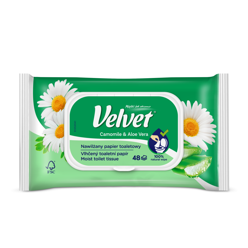 Vlhčený toaletní papír Velvet Camomile & Aloe Vera s extraktem z heřmánku a Aloe Vera je výrobek, který okouzlí svou jemnou vůní a poskytne pocit dokonalé čistoty a svěžesti.
