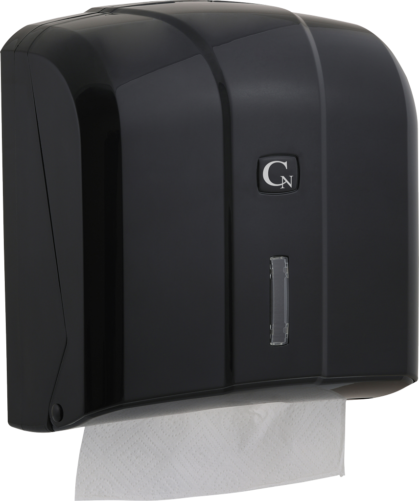Nástěnný zásobník na papírové ručníky"ZZ" v rozměru 23x25 cm, případně univerzální i pro jiné rozměry a sklady. Vyroben je z černého plastu. Má elegantní vzhled a při malých rozměrech je schopen pojmout až 400 ks ručníků.